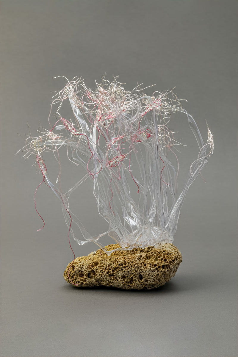 The lack of preciousness or rarity of the materials I use is counterbalanced by the time taken to transform them. I create my sculptures by assembling heterogeneous materials using traditional thread processing techniques (weaving, filet, gauze, crochet, tricot…) in new ways. The form of my works responds to needs of order, structure and regularity which often find support in the modularity of the whole.